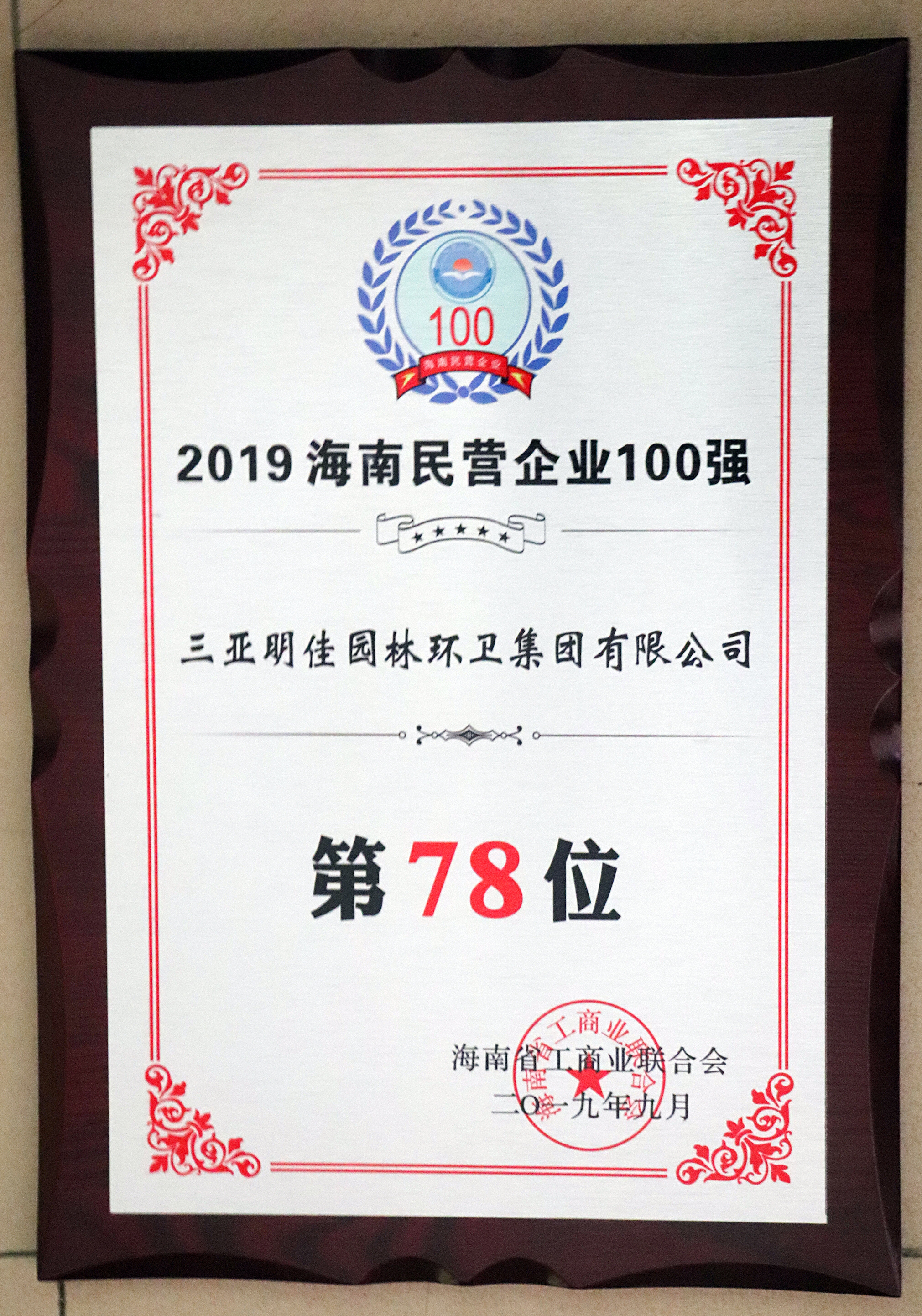 海南省工商聯(lián)24日在??诎l(fā)布2019海南省民營企業(yè)100強,三亞明佳園林環(huán)衛(wèi)集團有限公司名列第78位。