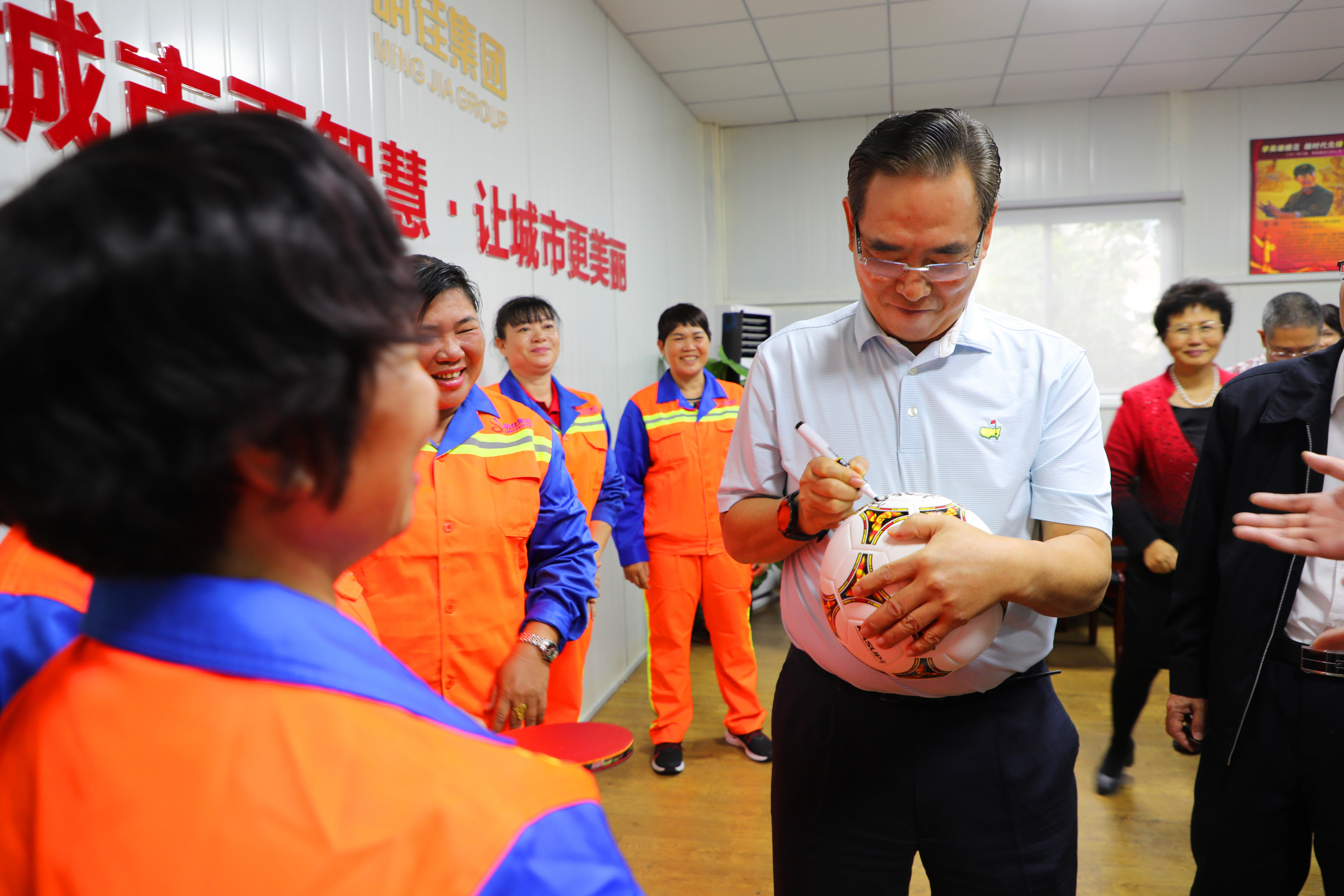 座談會結(jié)束后,明佳集團一些職工表示非常喜愛乒乓球及足球運動,一直都是蔡副主席的粉絲,希望獲得蔡振華副主席的親筆簽名。蔡副主席非常親切地為他們簽名,并與之合影留念。