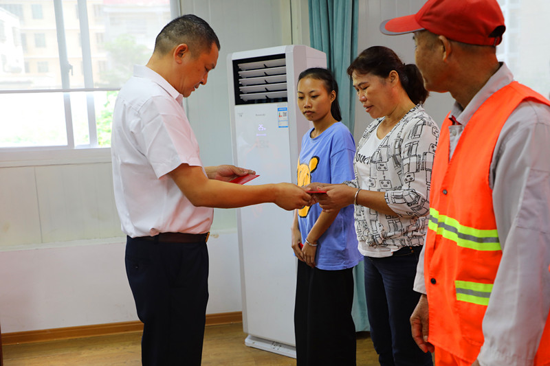 (生產(chǎn)部經(jīng)理楊洪向?qū)W生家長發(fā)放助學(xué)金)